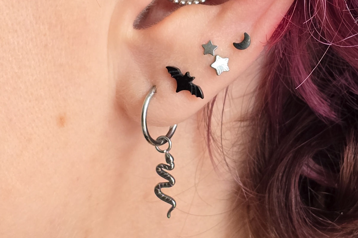 This titanium snake dangle charm brings an intriguing, mysterious element to your style, perfect for those who appreciate a touch of the unusual. Dangle charms pair perfectly with our standard 16g half-hinge titanium hoops. Part of our Creepy Critters Collection, it slithers with subtle allure. Crafted with the quality and durability to withstand daily wear, this charm is a unique statement piece for those who embrace a curious, unconventional aesthetic.